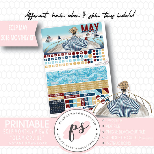 Glam Cruise May 2018 Monthly View Kit Digital Printable Planner Stickers (for Standard A5 Wide Monthly 1.6" Width Date Boxes)