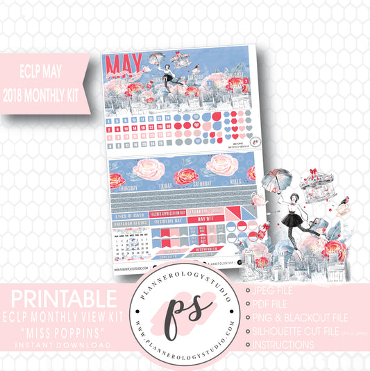 Miss Poppins (Mary Poppins) May 2018 Monthly View Kit Digital Printable Planner Stickers (for Standard A5 Wide Monthly 1.6" Width Date Boxes)