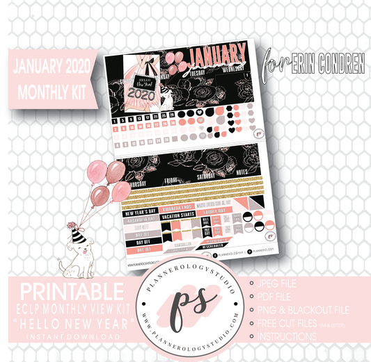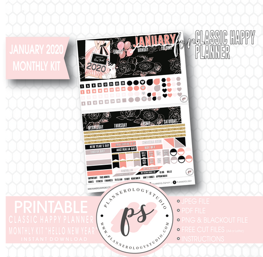 Hello New Year January 2020 Monthly View Kit Digital Printable Planner Stickers (for use with Classic Happy Planner)