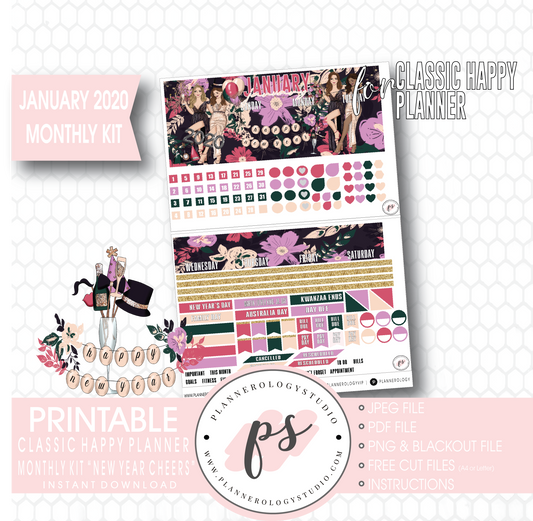 New Year Cheers January 2020 Monthly View Kit Digital Printable Planner Stickers (for use with Classic Happy Planner)
