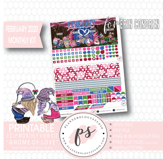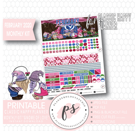 Gnome of Love (Valentines Day) February 2020 Monthly View Kit Digital Printable Planner Stickers (for use with Classic Happy Planner)