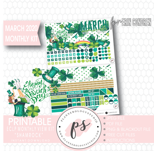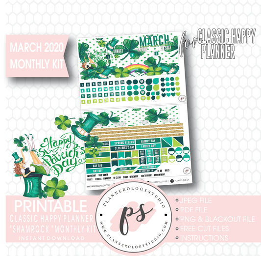 Shamrock St Patrick's Day March 2020 Monthly View Kit Digital Printable Planner Stickers (for use with Classic Happy Planner)