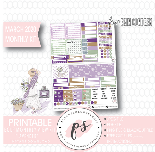 Lavender March 2020 Monthly View Kit Digital Printable Planner Stickers (for Standard A5 Wide Monthly 1.6" Width Date Boxes)