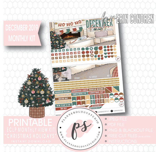 Christmas Holidays December 2019 Monthly View Kit Digital Printable Planner Stickers (for Standard A5 Wide Monthly 1.6" Width Date Boxes)