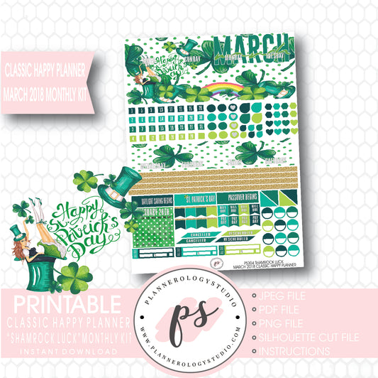Shamrock Luck St Patrick's Day March 2018 Monthly View Kit Digital Printable Planner Stickers (for use with Classic Happy Planner)