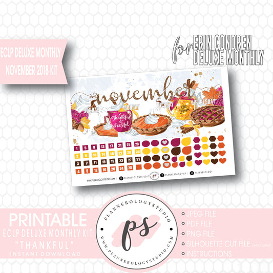 Thankful Thanksgiving November 2018 Monthly View Kit Digital Printable Planner Stickers (for use with Erin Condren Large Deluxe Monthly Planner)