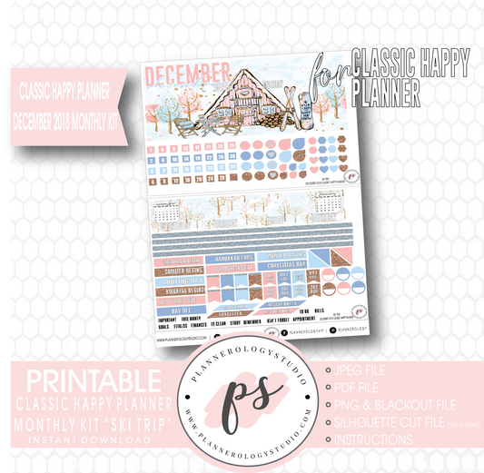 Ski Trip December 2018 Monthly View Kit Digital Printable Planner Stickers (for use with Classic Happy Planner)