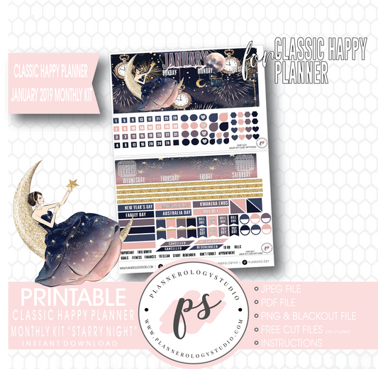 Starry Night New Years January 2019 Monthly View Kit Digital Printable Planner Stickers (for use with Classic Happy Planner)