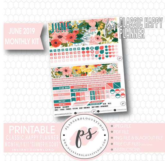 Summer Blooms June 2019 Monthly View Kit Digital Printable Planner Stickers (for use with Classic Happy Planner)