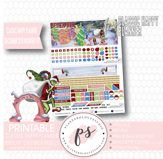 Christmas at Whoville (Grinch) December 2018 Monthly View Kit Digital Printable Planner Stickers (for use with Classic Happy Planner)