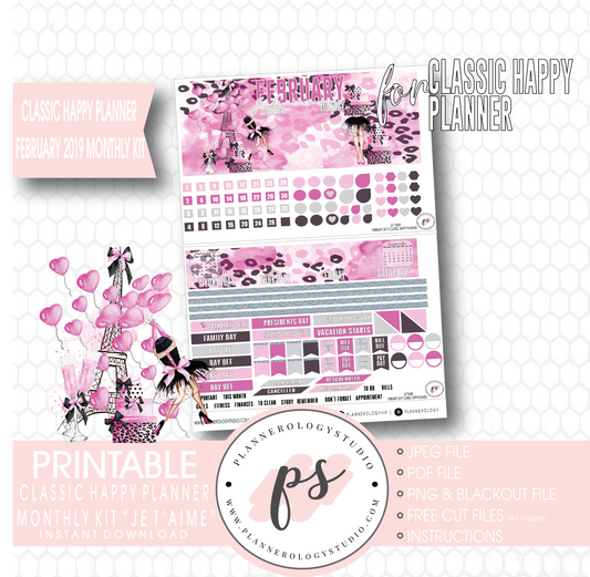 Je T'aime Valentine's Day February 2019 Monthly View Kit Digital Printable Planner Stickers (for use with Classic Happy Planner)
