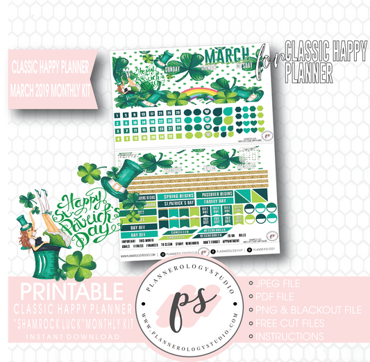 Shamrock Luck St Patrick's Day March 2019 Monthly View Kit Digital Printable Planner Stickers (for use with Classic Happy Planner)