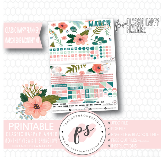 Spring Love March 2019 Monthly View Kit Digital Printable Planner Stickers (for use with Classic Happy Planner)