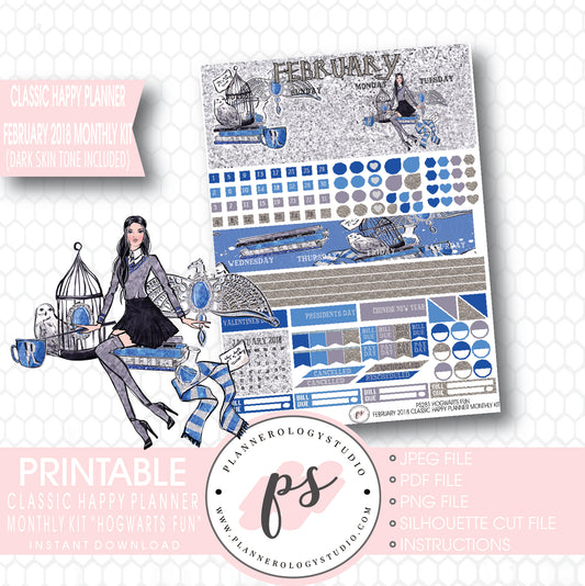 Hogwarts Fun (Harry Potter Theme) February 2018 Monthly View Kit Printable Planner Stickers (for use with Classic Happy Planner) (Dark & Light Skintone)