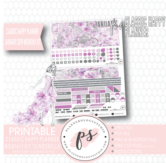 Cinderella New Years January 2019 Monthly View Kit Digital Printable Planner Stickers (for use with Classic Happy Planner)