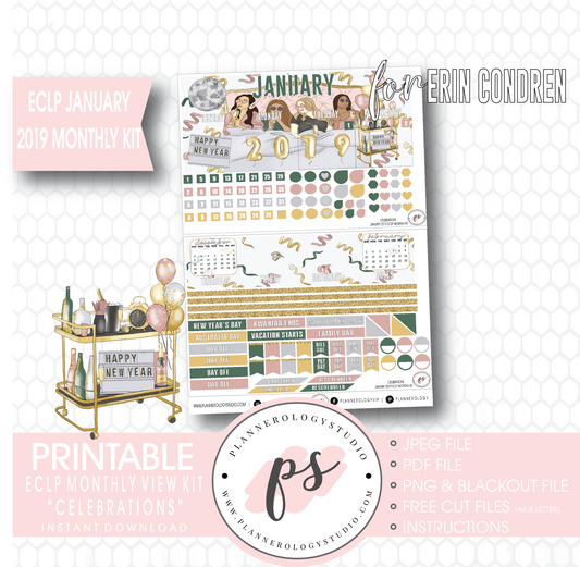 Celebrations New Years January 2019 Monthly View Kit Digital Printable Planner Stickers (for Standard A5 Wide Monthly 1.6" Width Date Boxes)