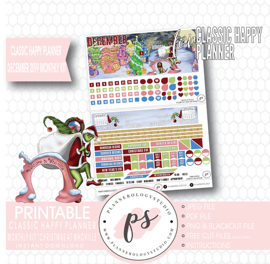 Christmas at Whoville (Grinch) December 2019 Monthly View Kit Digital Printable Planner Stickers (for use with Classic Happy Planner)