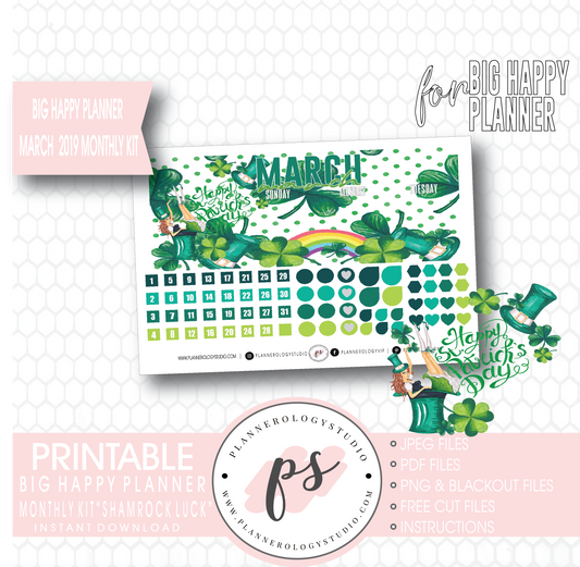 Shamrock Luck (St. Patrick's Day) March 2019 Monthly View Kit Digital Printable Planner Stickers (for use with Big Happy Planner)