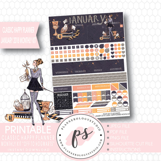 Off to Hogwarts (Harry Potter Theme) January 2018 Monthly View Kit Printable Planner Stickers (for use with Classic Happy Planner)