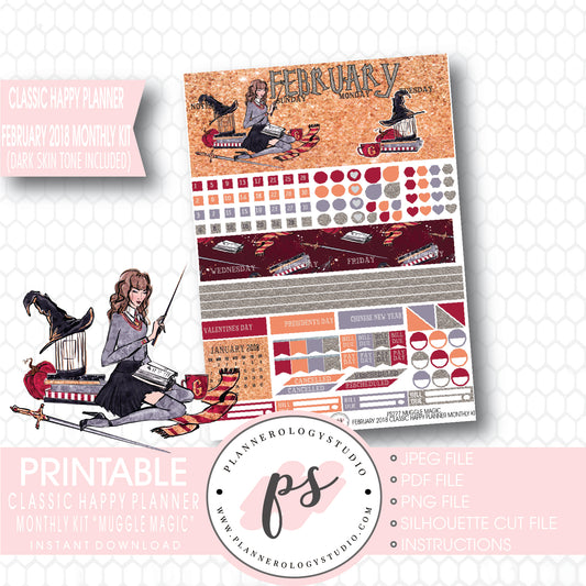 Muggle Magic (Harry Potter Theme) February 2018 Monthly View Kit Printable Planner Stickers (for use with Classic Happy Planner) (Dark & Light Skin Tone)
