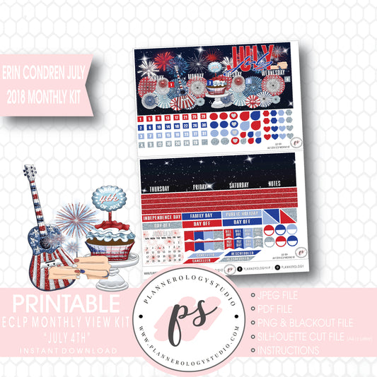 July 4th Independence Day July 2018 Monthly View Kit Digital Printable Planner Stickers (for Standard A5 Wide Monthly 1.6" Width Date Boxes)