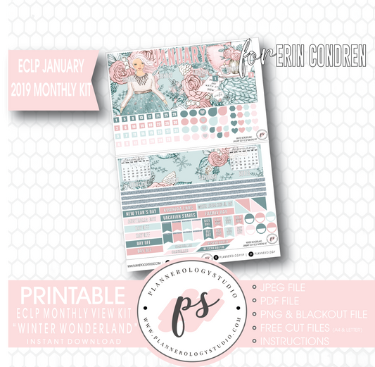 Winter Wonderland January 2019 Monthly View Kit Digital Printable Planner Stickers (for Standard A5 Wide Monthly 1.6" Width Date Boxes)