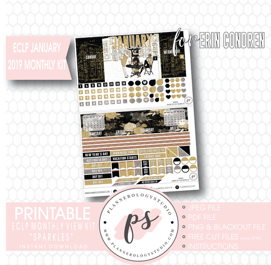Sparkles New Years January 2019 Monthly View Kit Digital Printable Planner Stickers (for Standard A5 Wide Monthly 1.6" Width Date Boxes)
