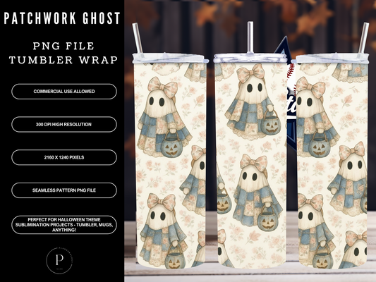 Patchwork Ghost 20oz Tumbler Wrap PNG | Whimsical Pastel Coquette Cozy Halloween Seamless Design | Sublimation Clipart | Commercial Use