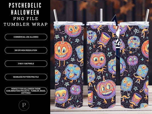 Psychedelic Halloween 20oz Skinny Tumbler Wrap PNG | Iridescent Seamless Sublimation Design | Quirky Fun High-Res | Commercial Use