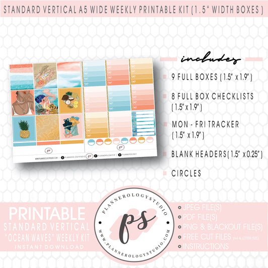 Ocean Waves Weekly Digital Printable Planner Stickers Kit (for use with Standard Vertical A5 Wide Planners)