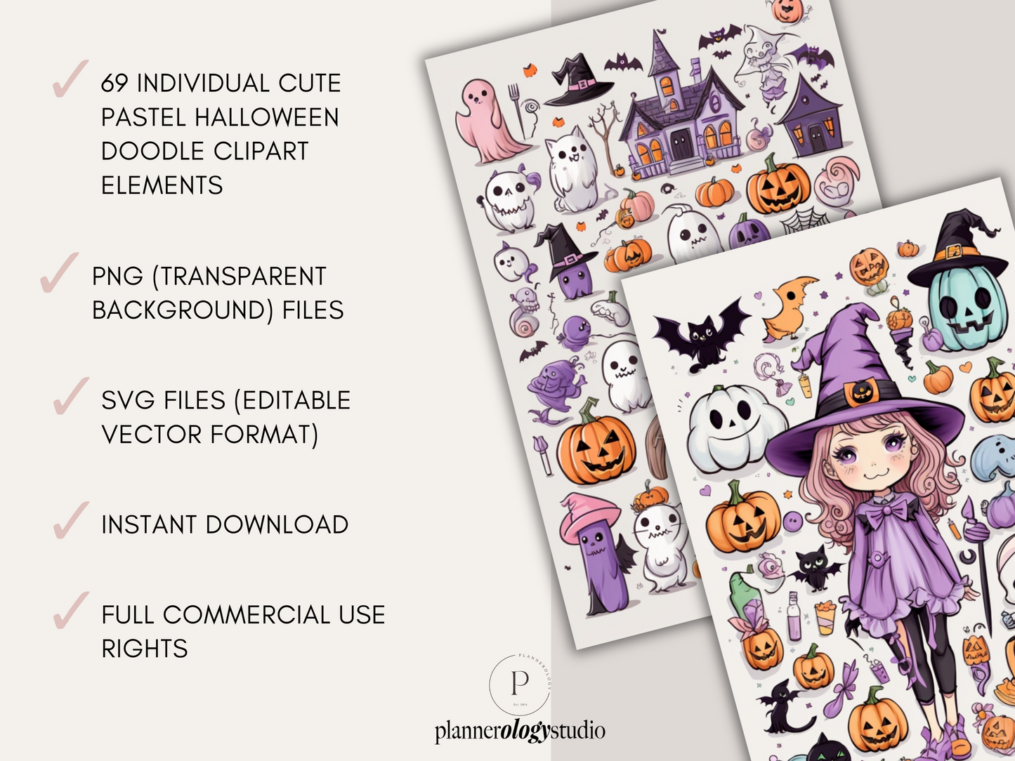 Cute Pastel Halloween Doodle Elements Clipart | 69 PNG & SVG Bundle | Digital Download | Full Commercial Use Allowed