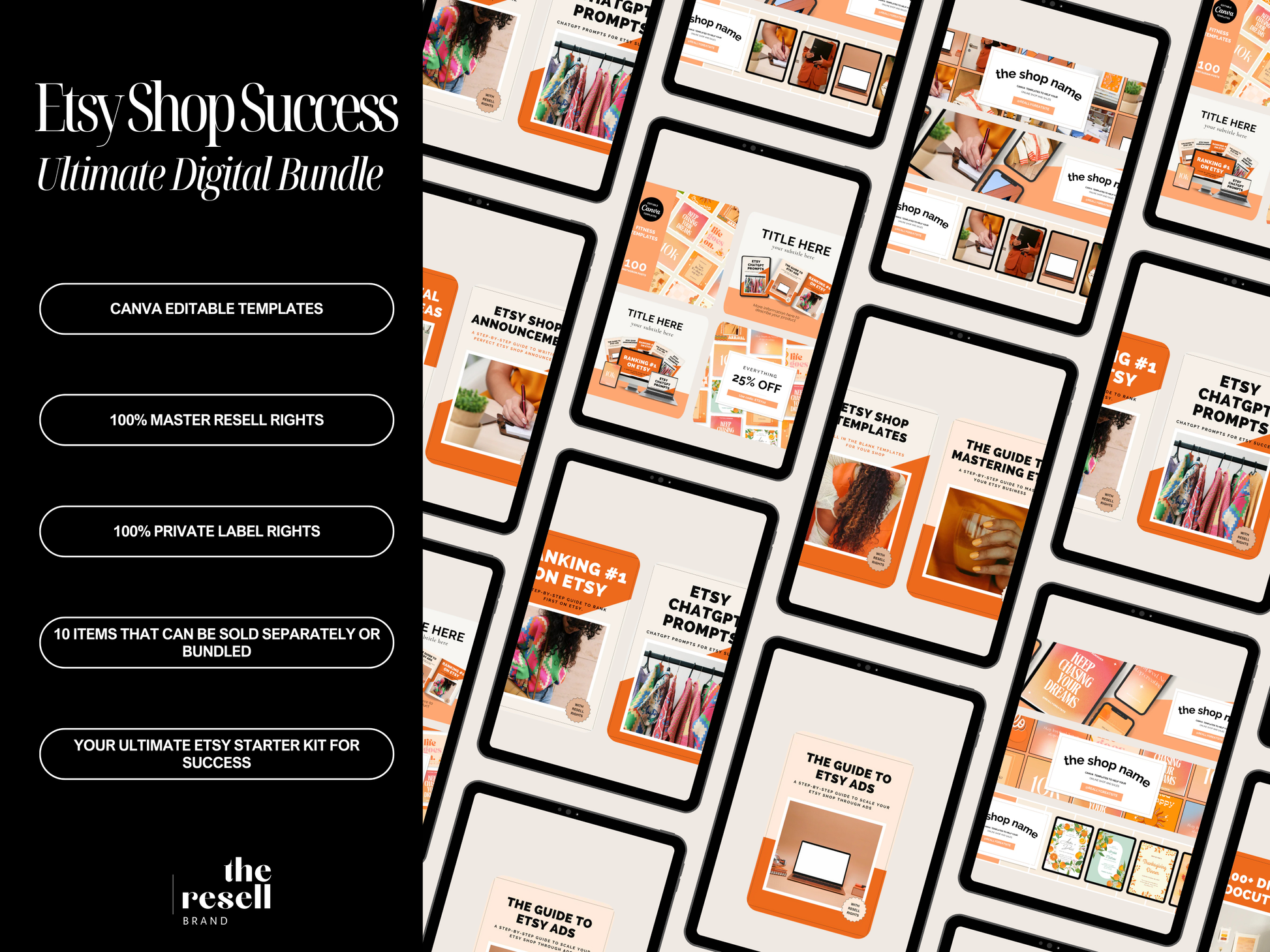Launch or grow your Etsy business faster with the Etsy Digital Shop Bundle — a complete toolkit packed with Private Label Rights (PLR) and Master Resell Rights (MRR) so you can customize (with a free Canva account), brand, and even resell the resources as your own. All digital products in this bundle are editable in Canva.