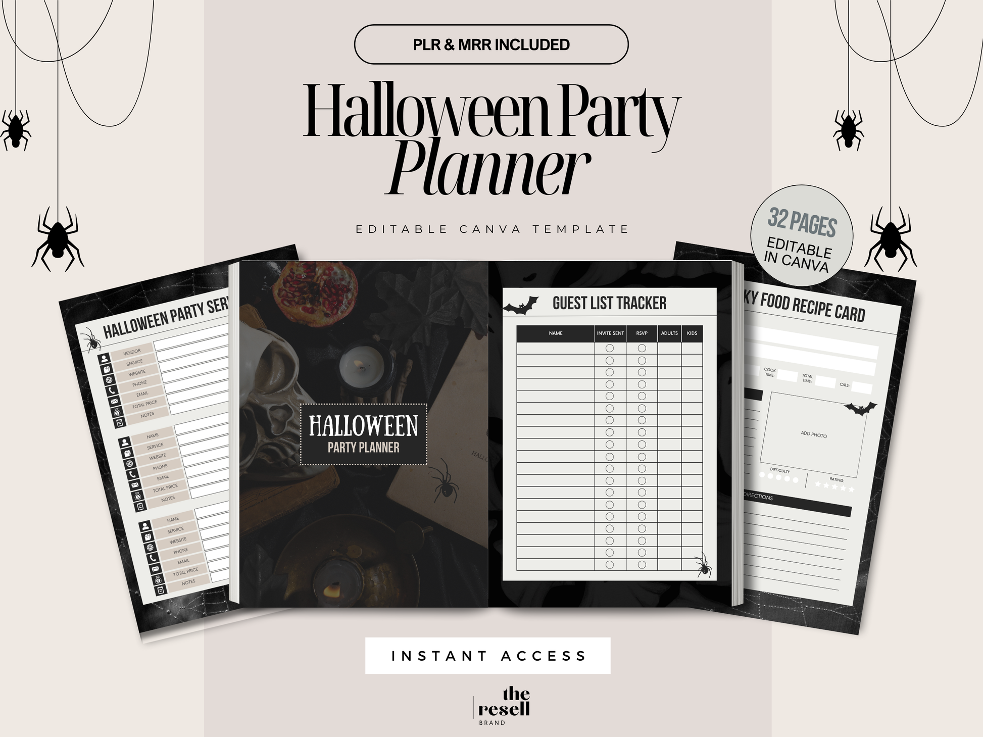Halloween Party Planner Canva Template | 32 Page Printable PDF w/ Trackers, Checklists | PLR MRR Digital Halloween Organizer