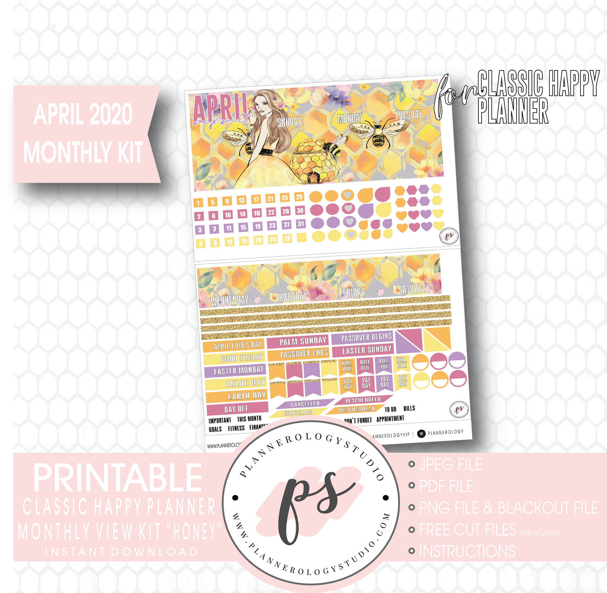 Honey April 2020 Monthly View Kit Digital Printable Planner Stickers (for use with Classic Happy Planner)
