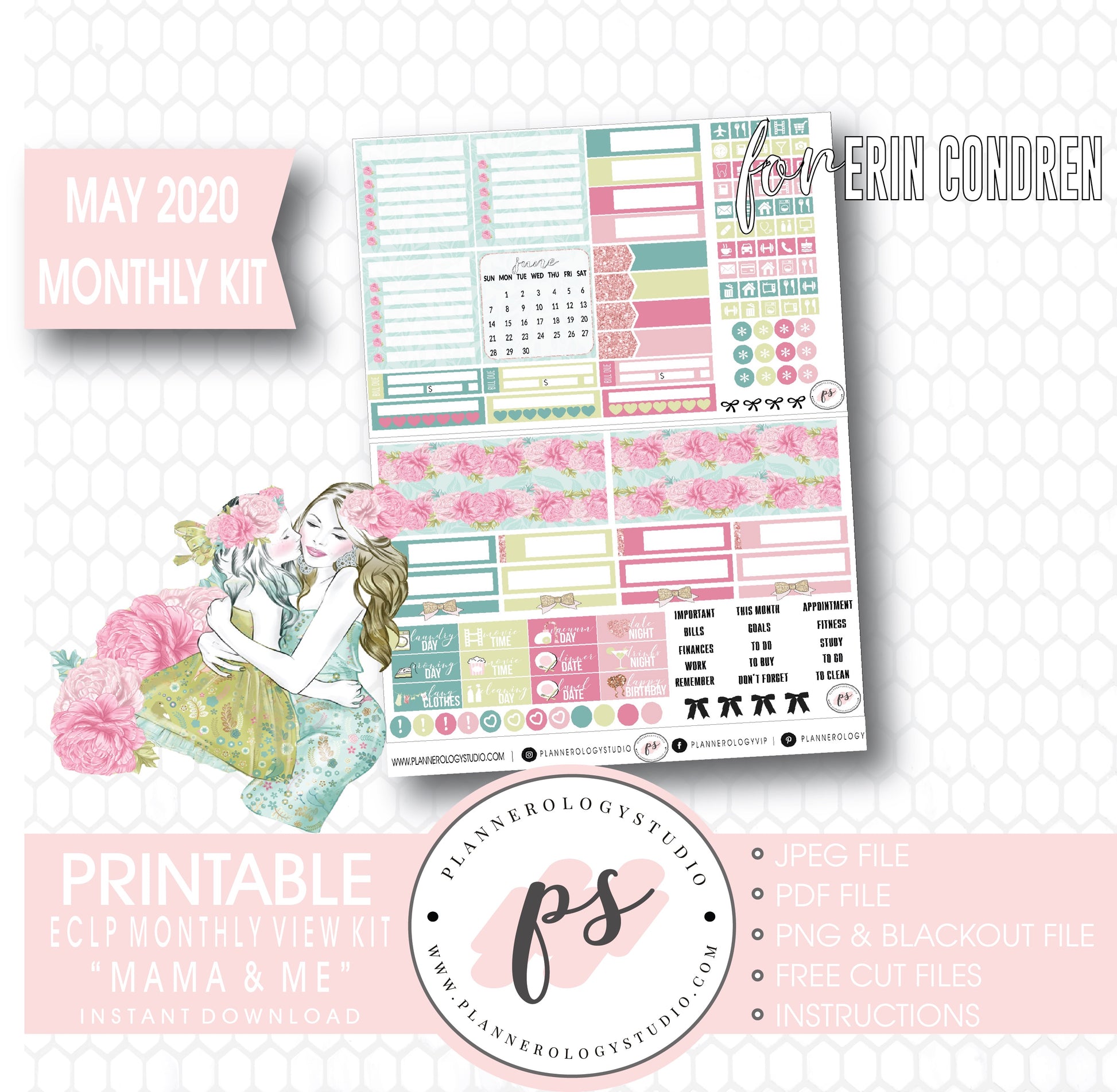"Mama & Me" is a mother and daughter Mother's Day theme printable monthly kit for the month of May 2020, sized to fit the Erin Condren Lifeplanner monthly view pages. The printable kit comprises of 2 individual sheets. Trim lines are included so that you can cut the sheets into smaller sheets for easier storage (either manually or using your Silhouette).