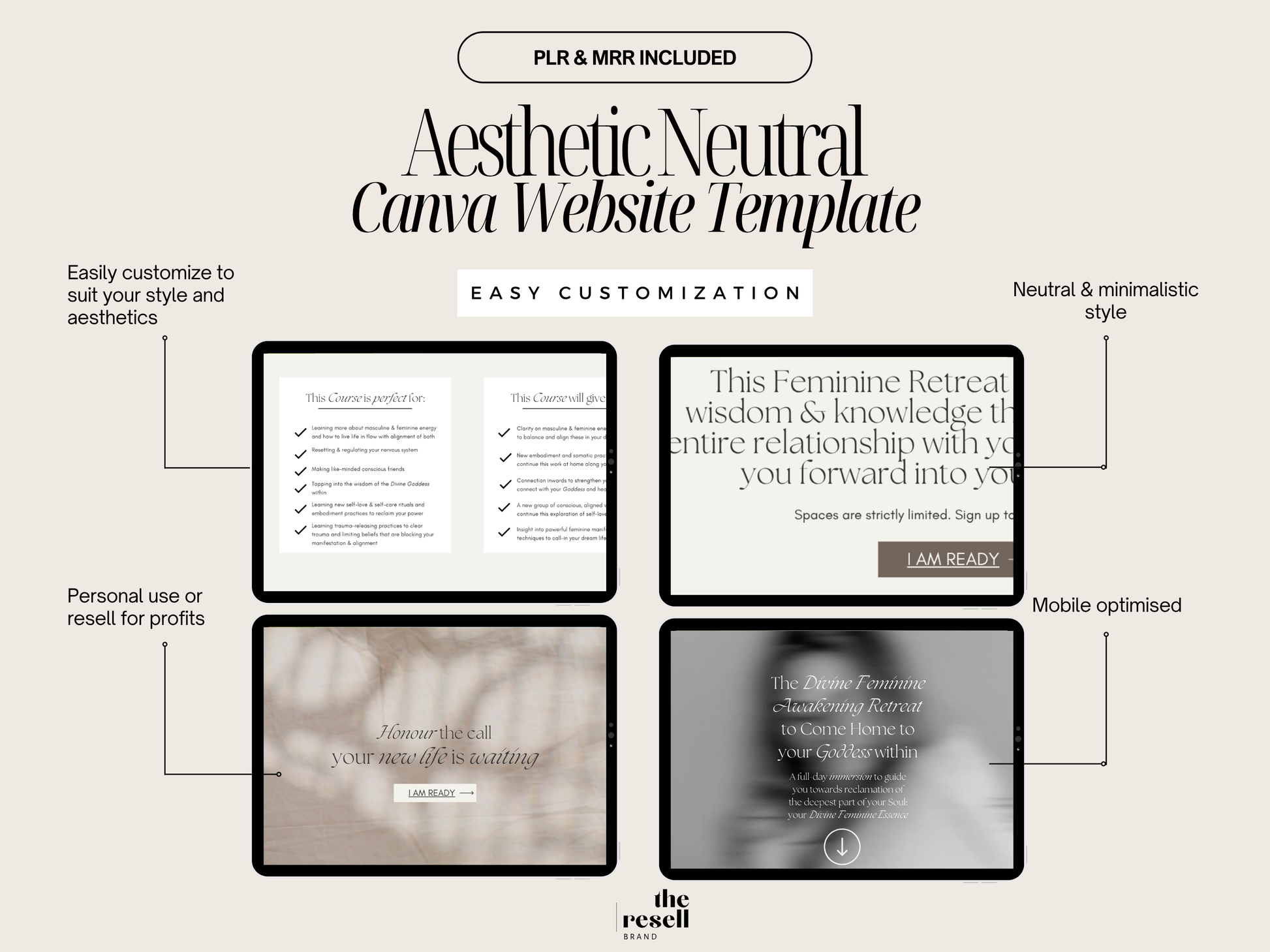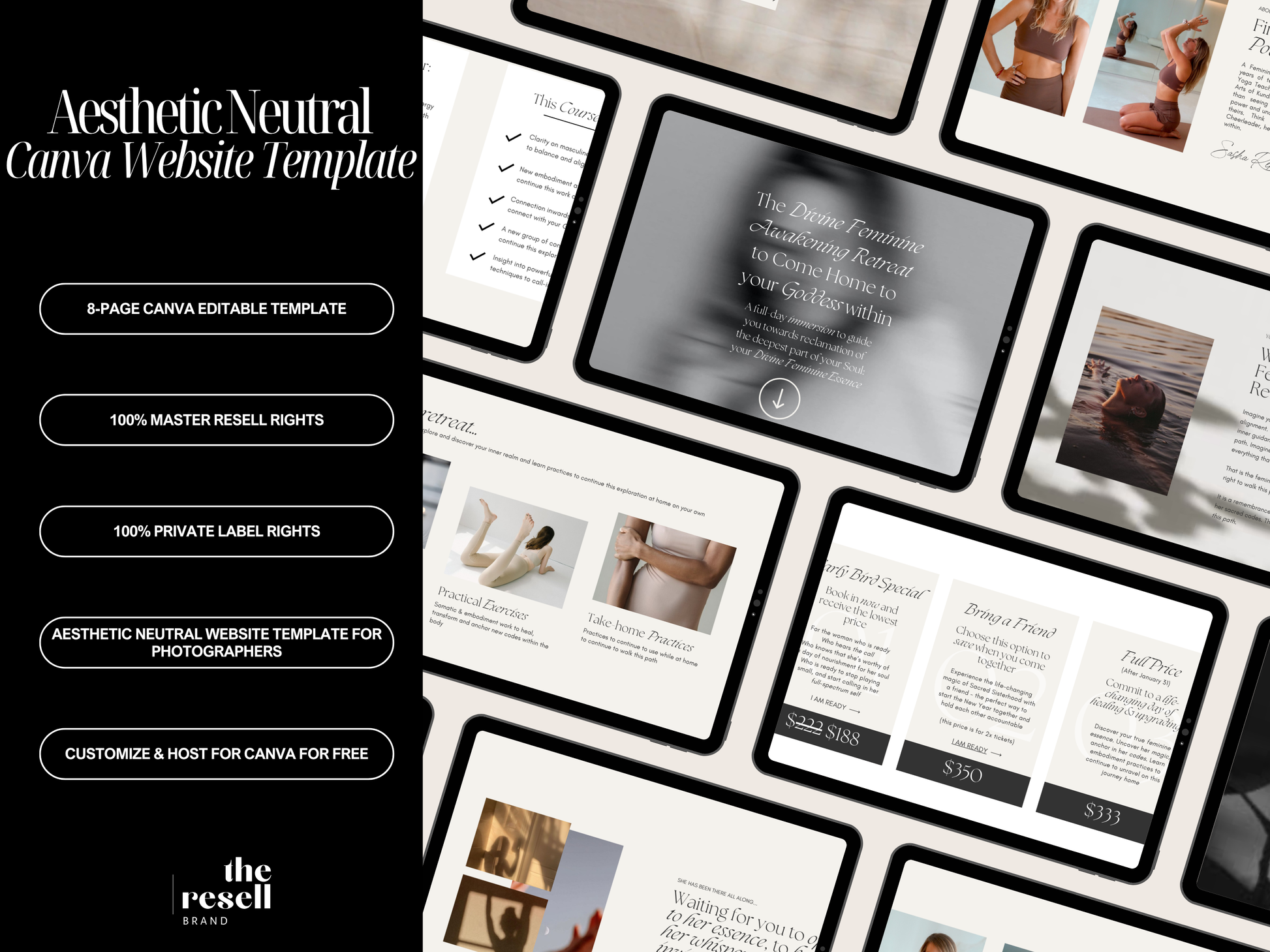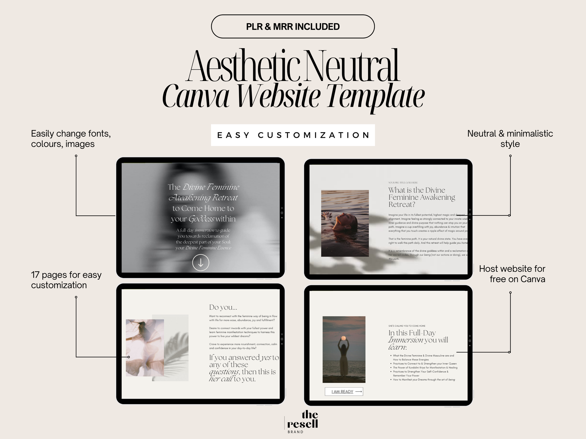 Neutral Aesthetic Canva Website Template | 17 Editable Pages | Yoga Fitness Beauty Influencer Coach Site | PLR + MRR | Minimalist Design