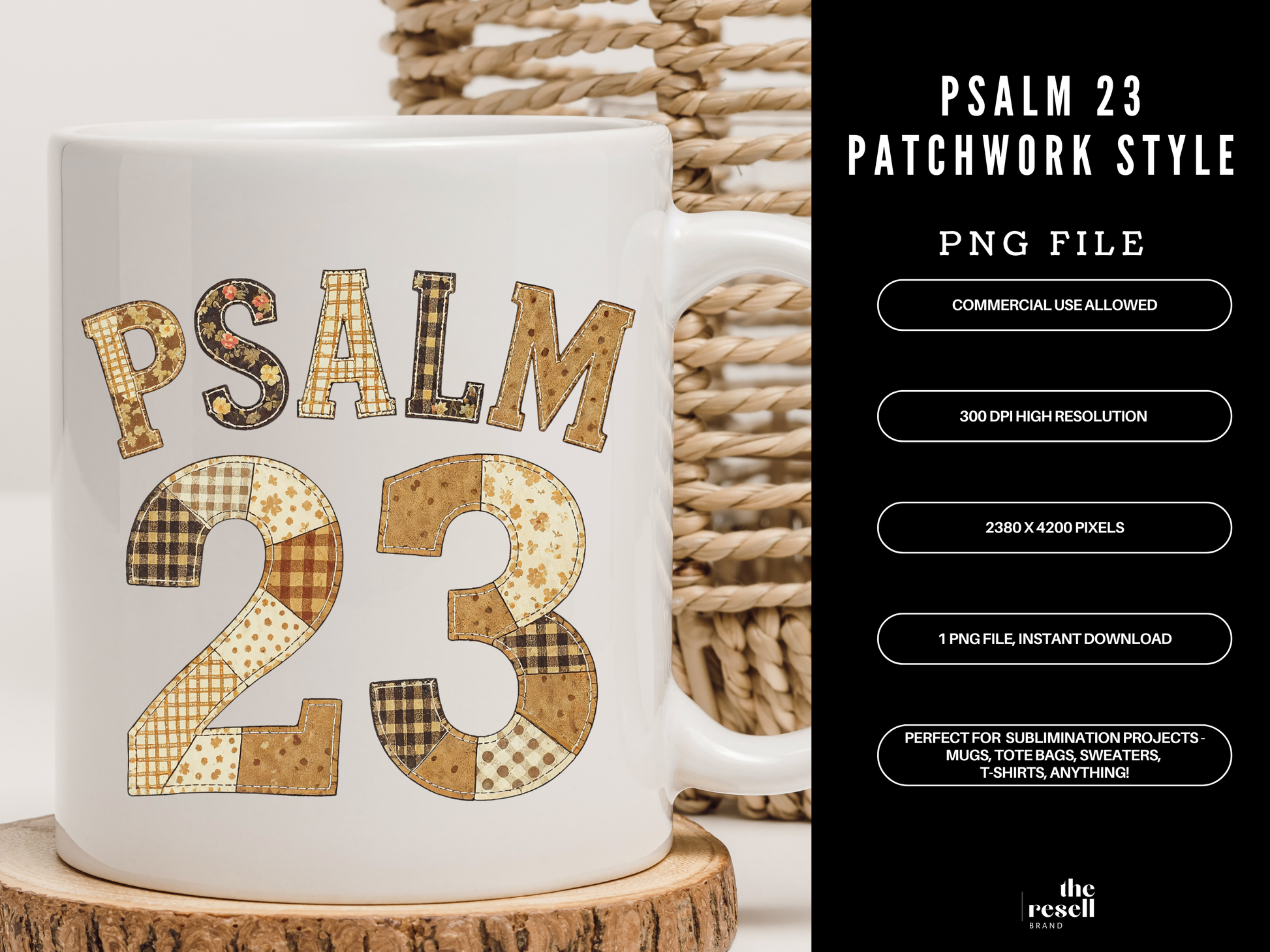 Celebrate faith with cozy, homespun charm using this Psalm 23 Patchwork PNG! Designed in a warm rustic patchwork style, this high-resolution PNG features “Psalm 23” crafted from stitched fabrics, vintage florals, and classic quilt textures — perfect for t-shirts, tote bags, sweaters, mugs, Bible covers, and other inspirational sublimation projects.