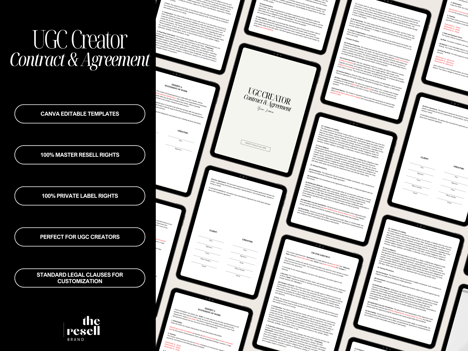 This 8-page UGC Creator Legal Contract Template is the plug-and-play solution every content creator, influencer, and UGC freelancer needs to work with brands confidently. Professionally written and fully editable in Canva, you can use it as-is, customize for your brand, or even resell it with included PLR + MRR rights.